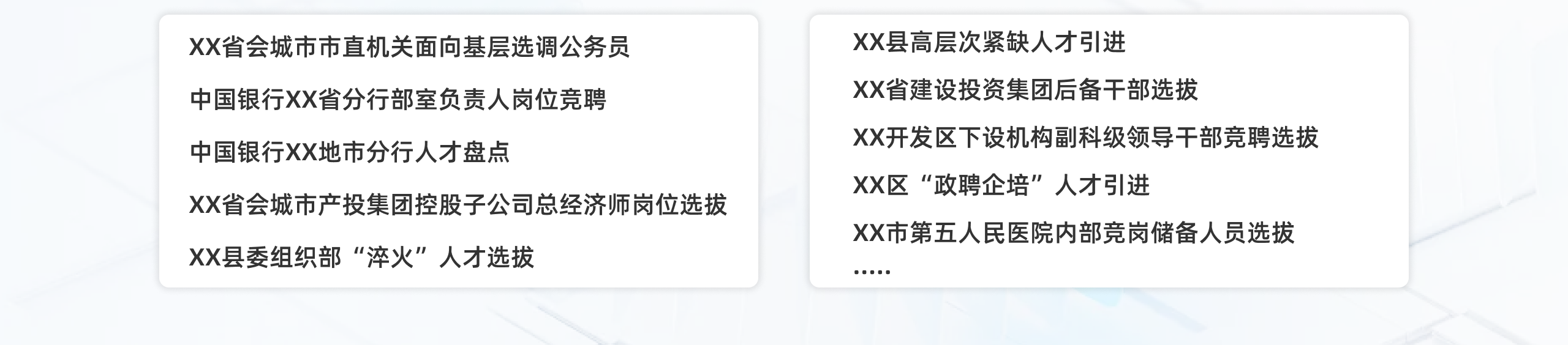 20年的胜任素质和评价中心技术等核心测评理论研究与成功实践经验,为党政机关、企事业单位领导干部遴选、管理人员内部竞聘、高层次人才选拔、后备人才库建设、人才盘点等提供专业人才测评服务。